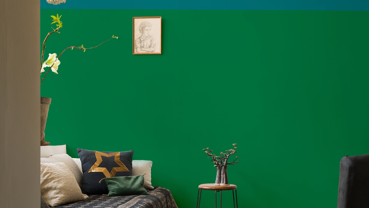 Make the most of your natural furnishings by setting them off against look-at-me walls. A rustic wooden table really stands out against a rich green wall – nodding to its natural roots while giving it a modern look at the same time. And plants are brought to life when set against a striped wall showcasing a spectrum of greens or a wall divided into two distinct block colours.