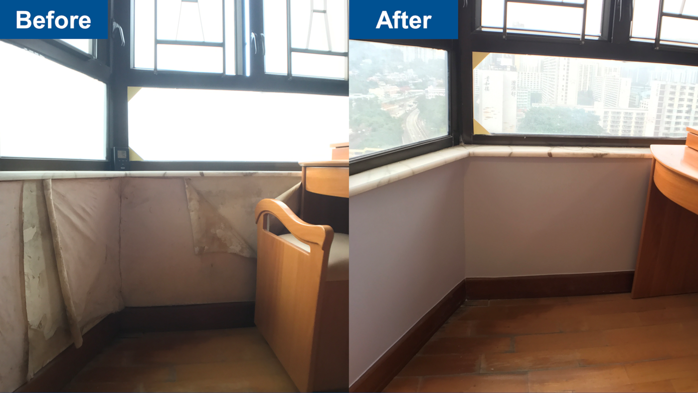 除去發霉及殘舊牆紙,重新剷底、批灰後打磨及髹油 (連全屋傢俬保護)